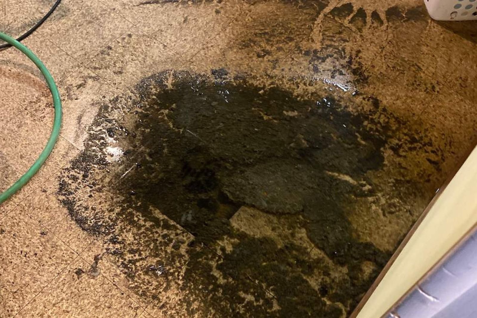 This is sewage or river water with waste. It is very dangerous and needs expert cleaning to stay safe.